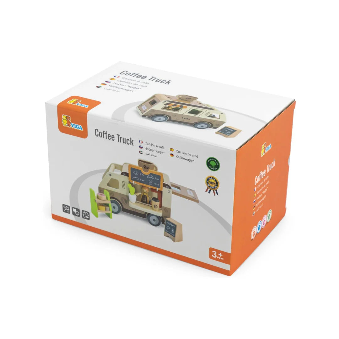 Ready for a coffee break at the Viga Café on wheels? This charming coffee truck includes everything your little one needs to run their own café, featuring a friendly barista, a snack shelf, and a variety of tasty treats like a donut, croissant, and bread. The set also comes with coffee, a decorative flower, a café sign, a coffee machine, a table, and a chalkboard for added realism.