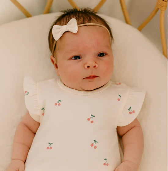 Sweet, breezy, and beautifully made, the Cherry Flutter Top is a charming addition to your little one’s wardrobe. Crafted from 100% GOTS-certified organic cotton, it features an all-over twin cherry print on a soft natural base. The ruffle cap sleeves are finished with delicate crochet lace trim, adding a soft, feminine touch to this playful design.